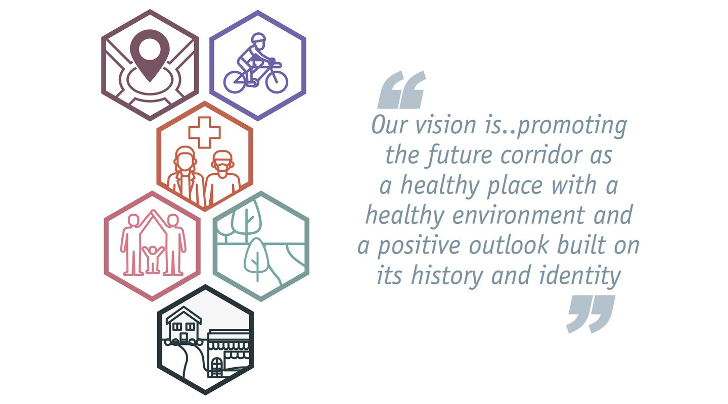 Promoting health and wellbeing was a principle that shaped the vision and principles for the corridor. These included strategic land use issues as well as promoting active travel: