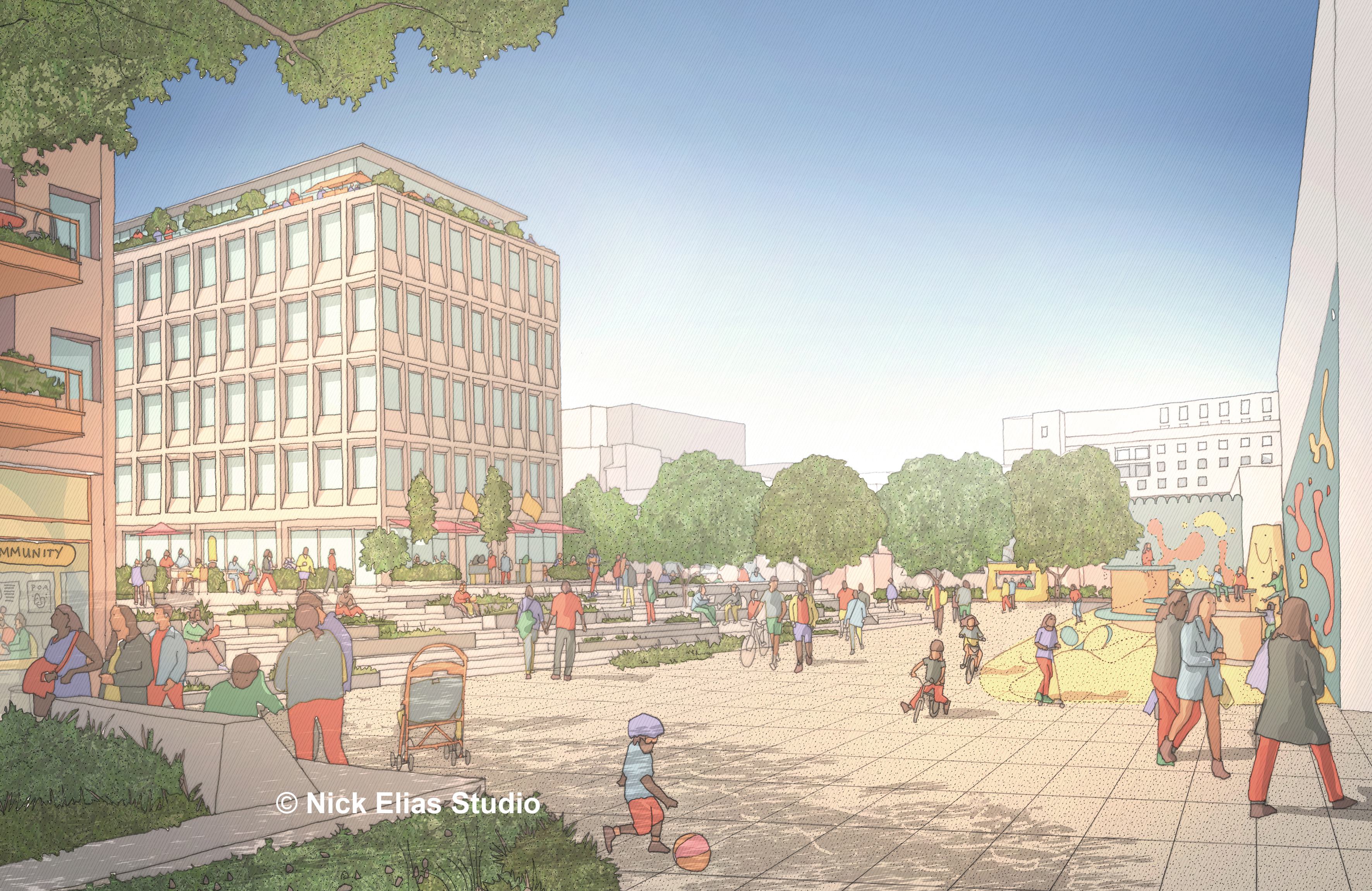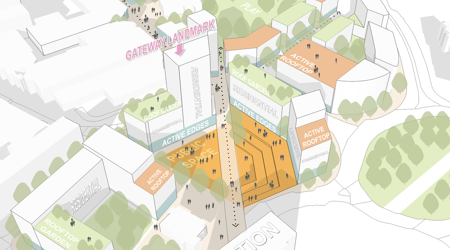 Together the sites create a more outward facing centre and help reinforce the town centre as a destination for people to visit and live in. The proposals prioritise walking and cycling and remodel roads to establish a better-connected and more legible centre. These plans will make the town centre more vibrant and welcoming by supporting the retail core with complementary uses, a residential community and provide public space, play and opportunity for community events.