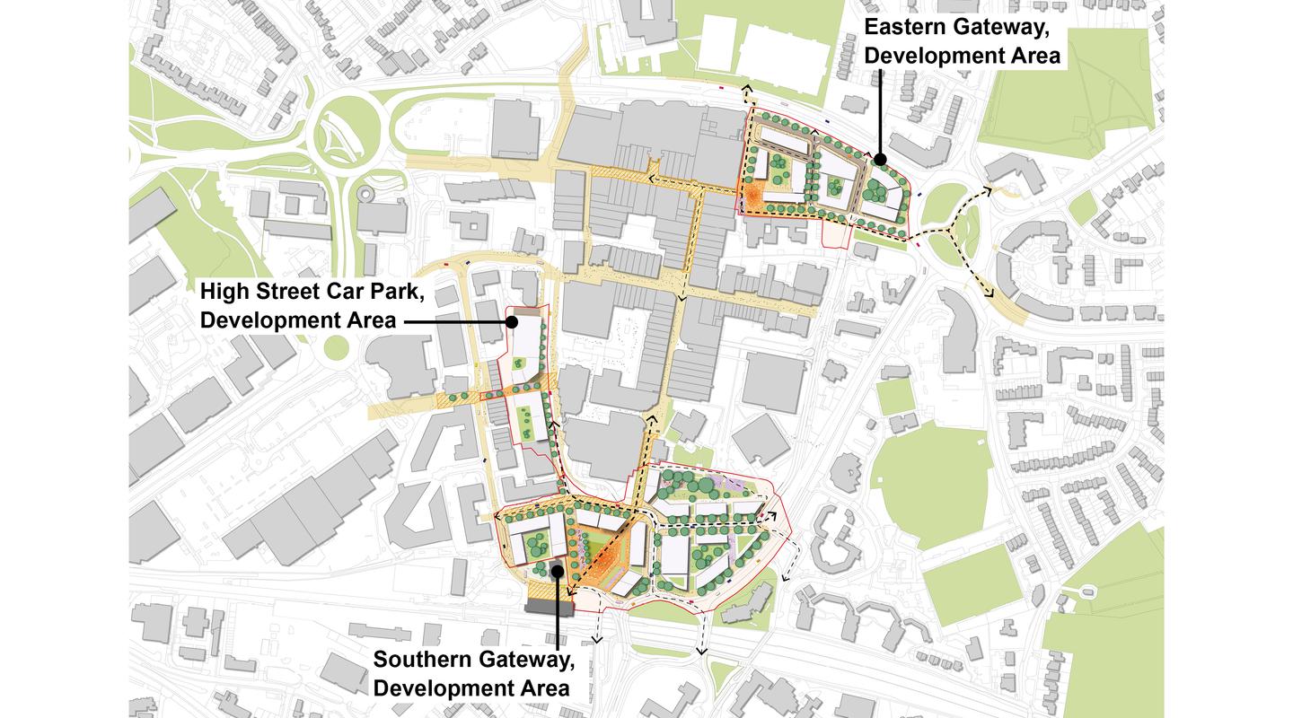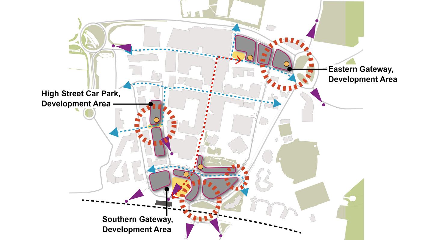 Two sites cover the Southern and Eastern Gateways, that form key approaches to the town centre and have direct links into the heart of the centre. The third site, the High Street Car Park currently hinders direct and legible access to the town centre from the west. Combined these three sites have the opportunity to remove barriers and improve the integration of the town centre.